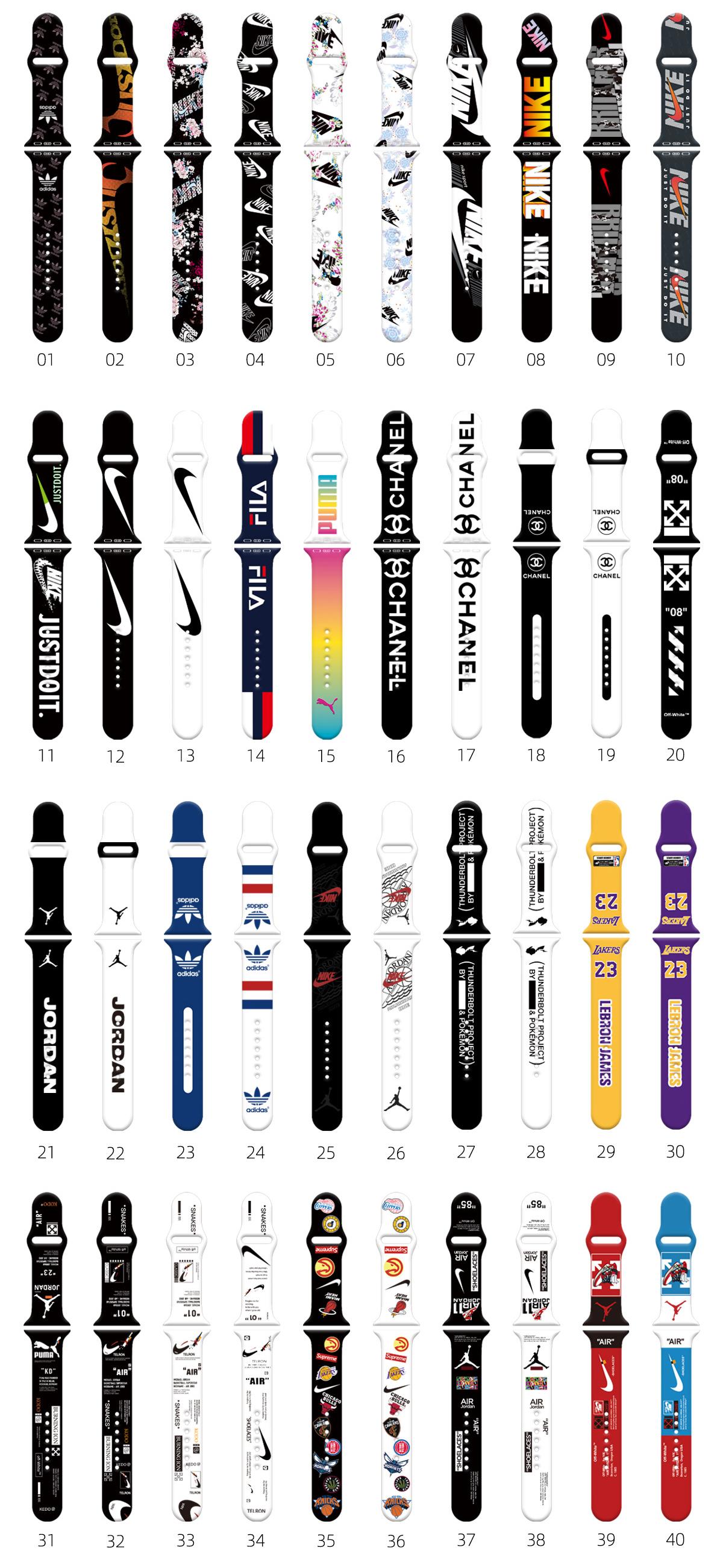 Elevate your Apple Watch's style with our Fashion Collection Silicone Bands. These bands feature iconic designs from NK, Air Jordan 1, Just Do It, Adids, and NBA. Available in sizes 38mm/40mm/41mm and 42mm/44mm/45mm/46mm/49mm, these bands offer a perfect fit. Choose from a range of numbers 2-39 for a personalized touch. With a durable silicone material, these bands provide comfort and durability for everyday wear. Enhance your Apple Watch with these fashionable and functional bands.