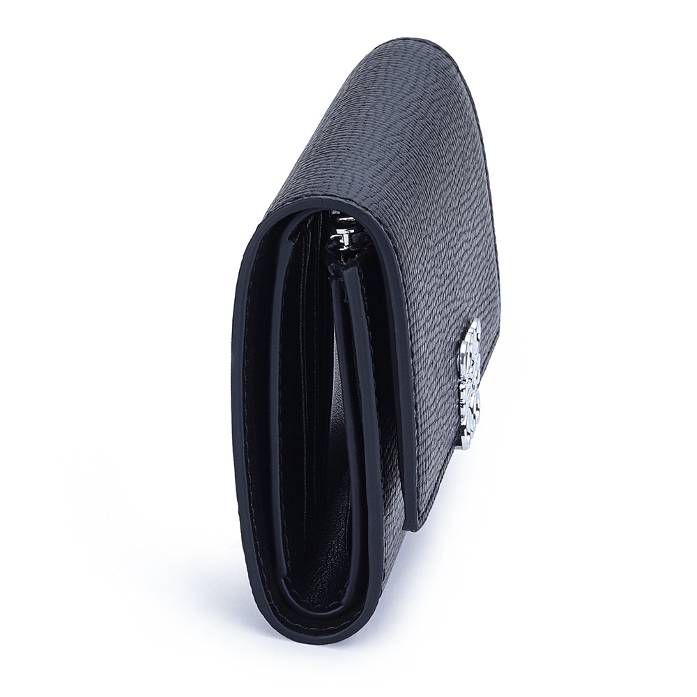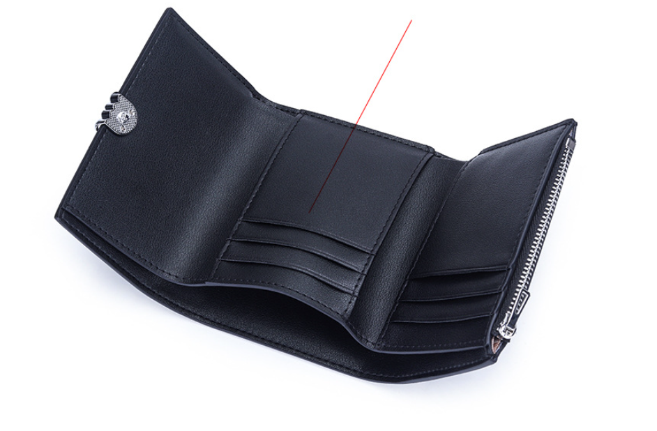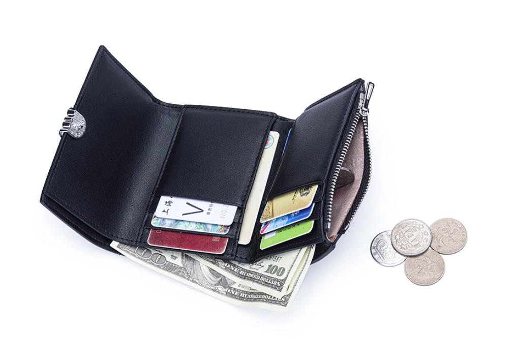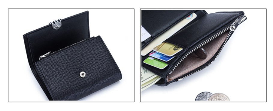 This leather wallet features a button-style magnetic closure. The central zip pocket and two large storage compartments can store cards, banknotes, coins and other daily documents.