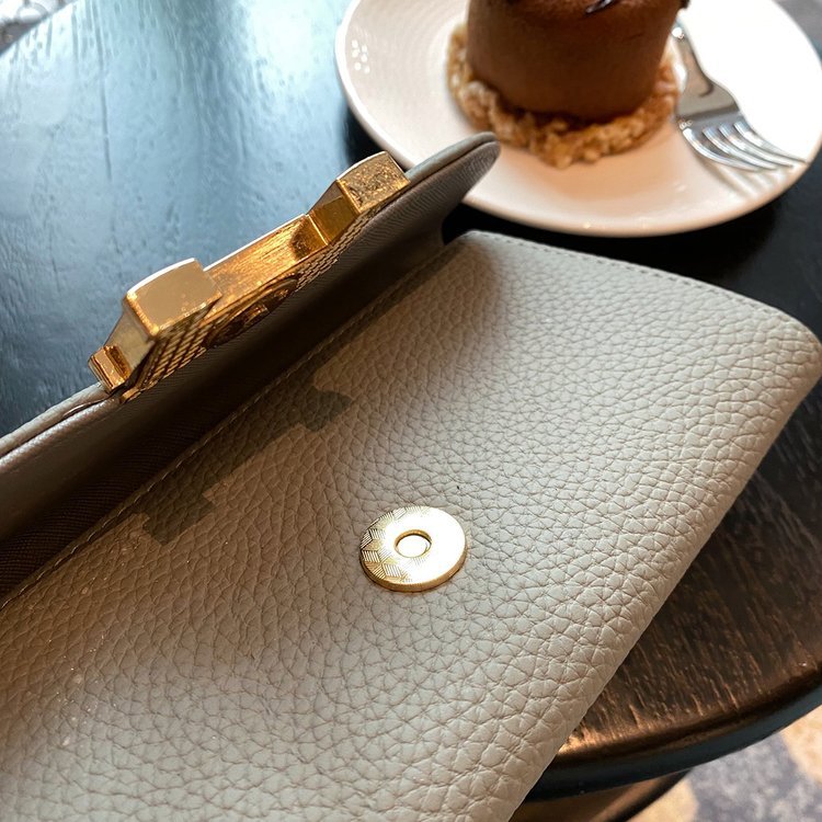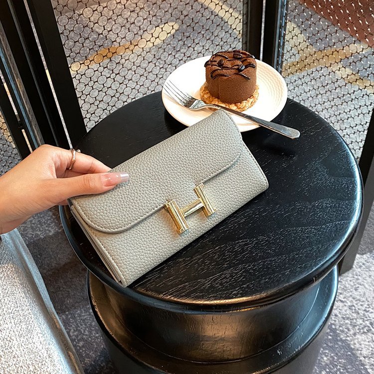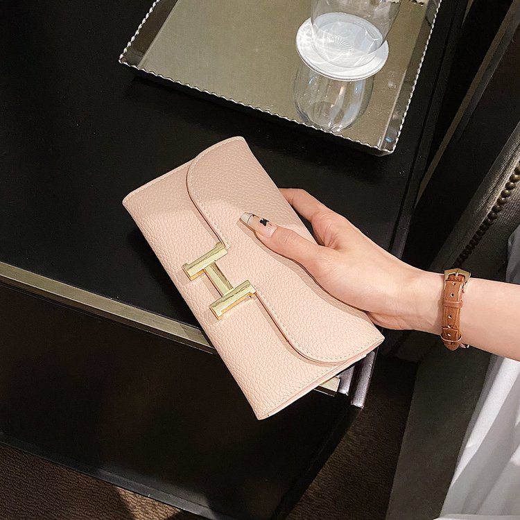 This long leather wallet features a button-style magnetic closure. The central zip pocket and two large storage compartments can store cards, banknotes, coins and other daily documents.