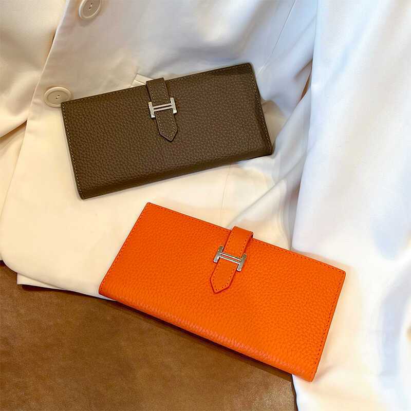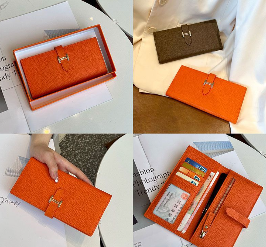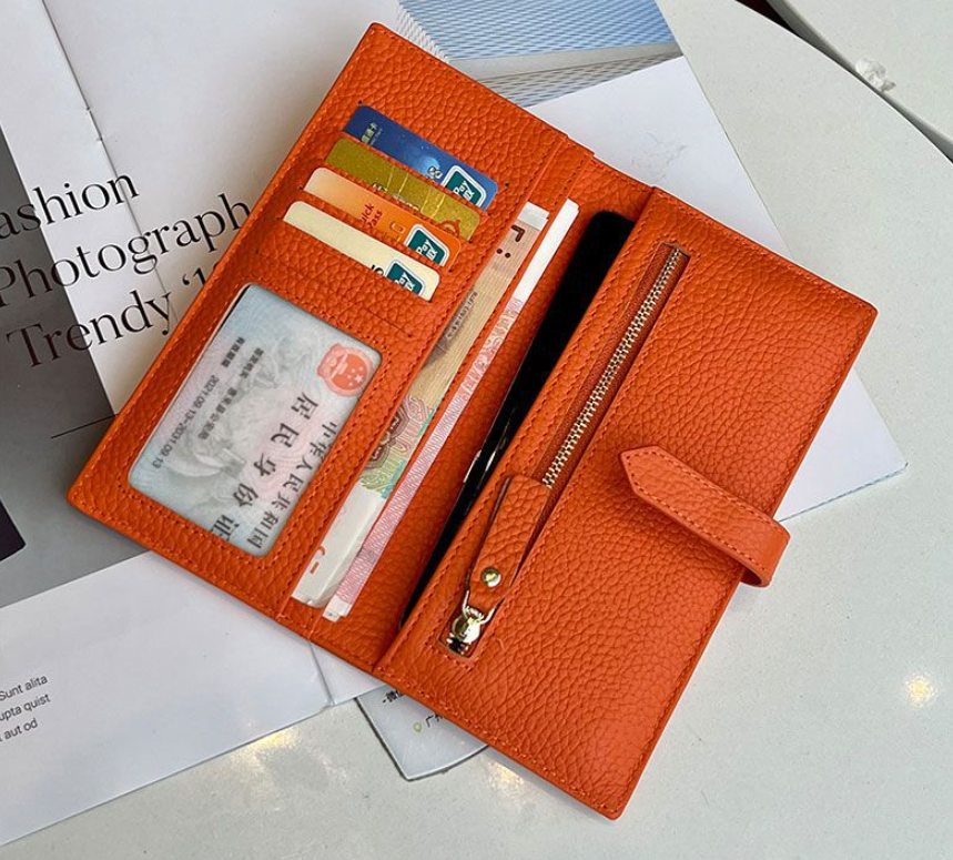 This long leather wallet features a button-style magnetic closure. The central zip pocket and two large storage compartments can store cards, banknotes, coins and other daily documents.