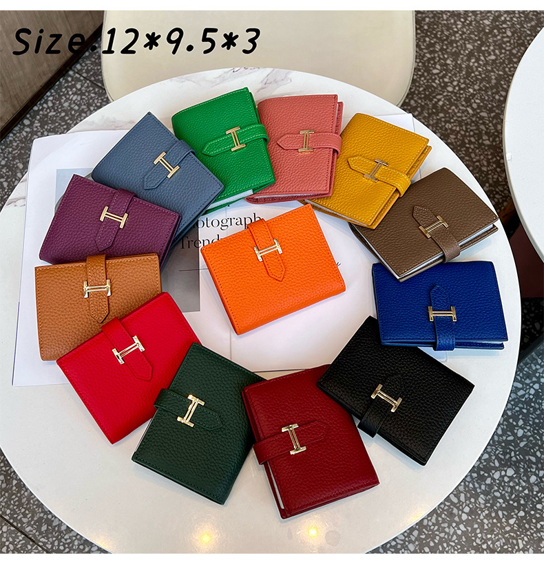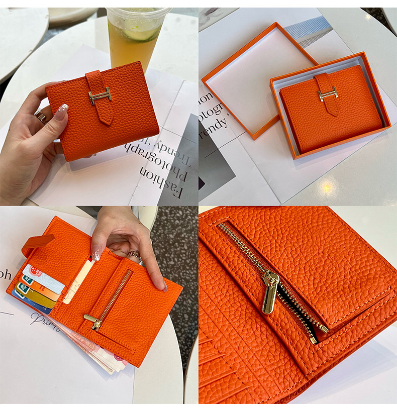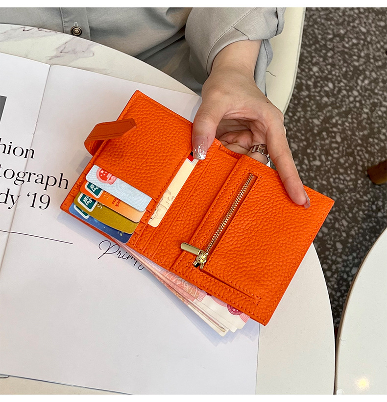 This leather wallet features a button-style magnetic closure. The central zip pocket and two large storage compartments can store cards, banknotes, coins and other daily documents.